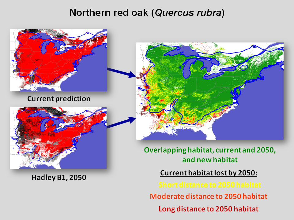 The differences between the existing distribution for each species in current time (the blue outlines on the map) and the predicted habitat in current time (in red) are not unexpected: Existing environmentally suitable habitat for a species (its fundamental ecological niche) will almost always be broader than its actual distribution (its realized fundamental niche) because of inter-species interactions and biogeographical history, among other reasons.