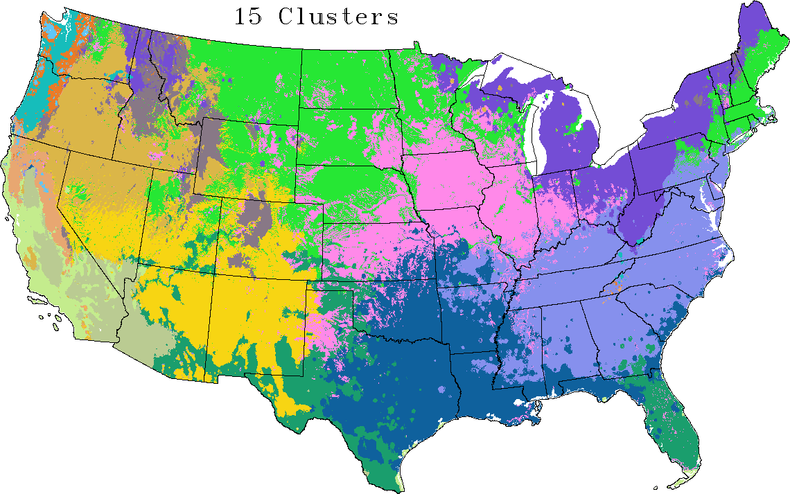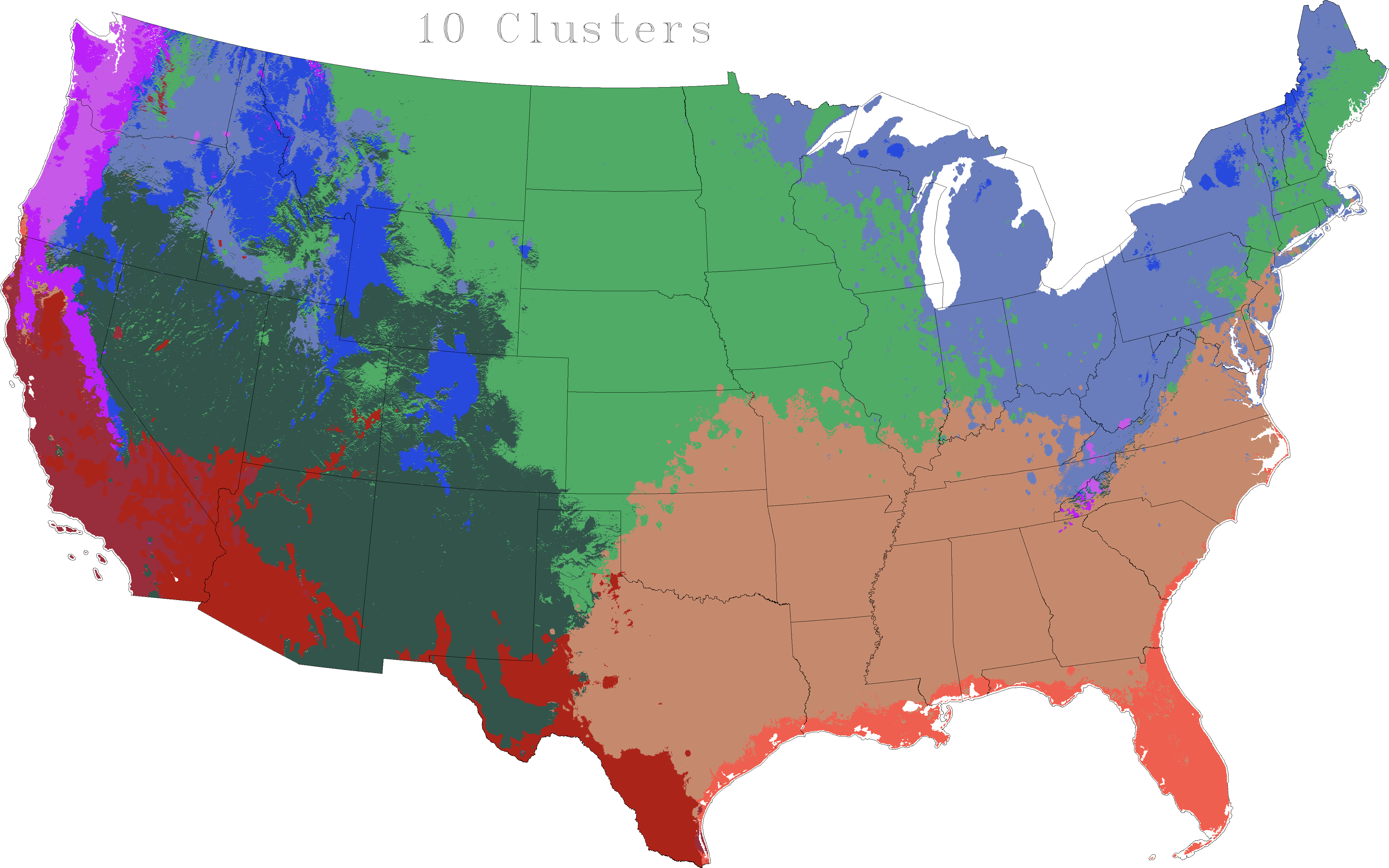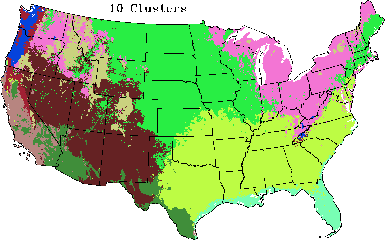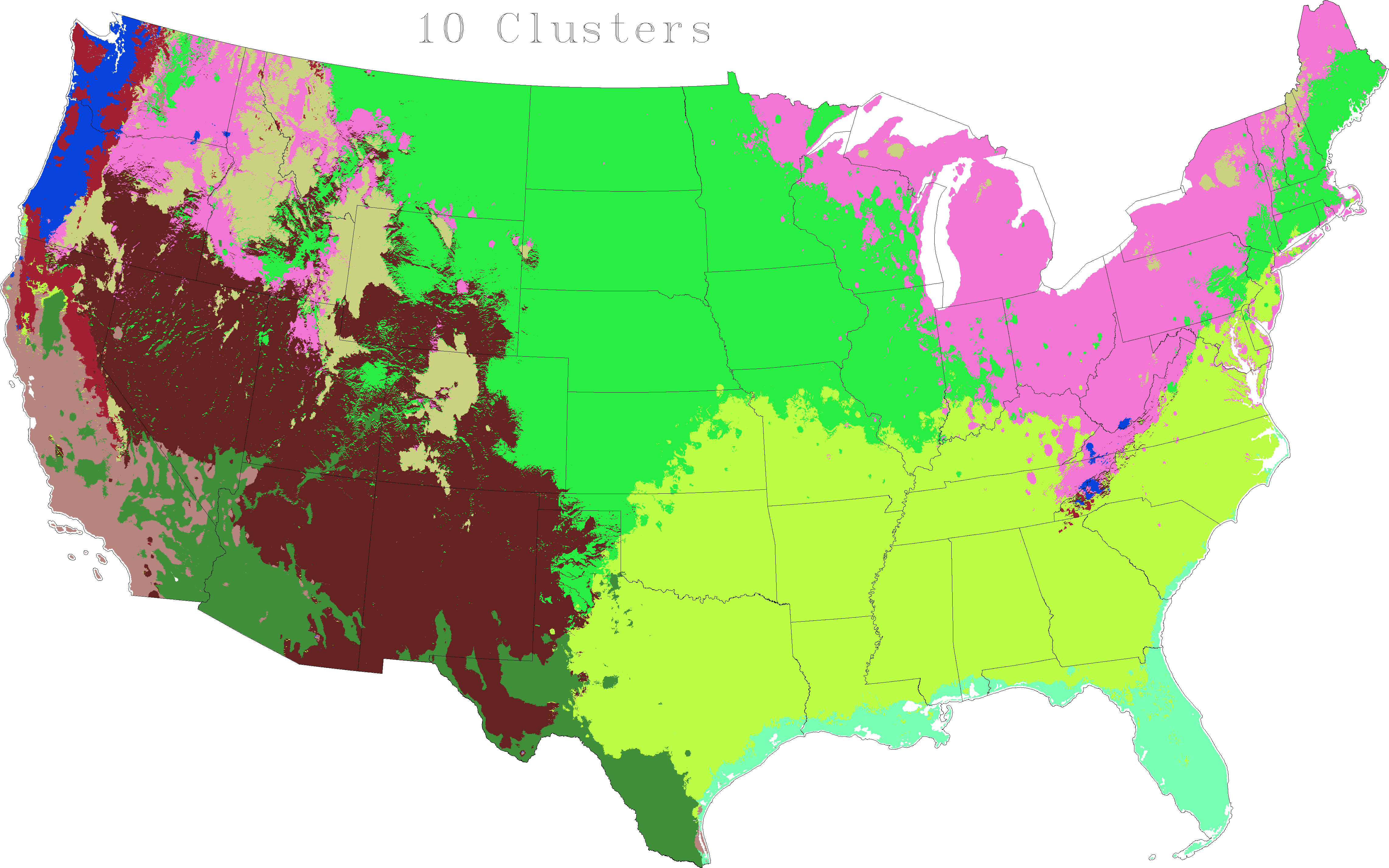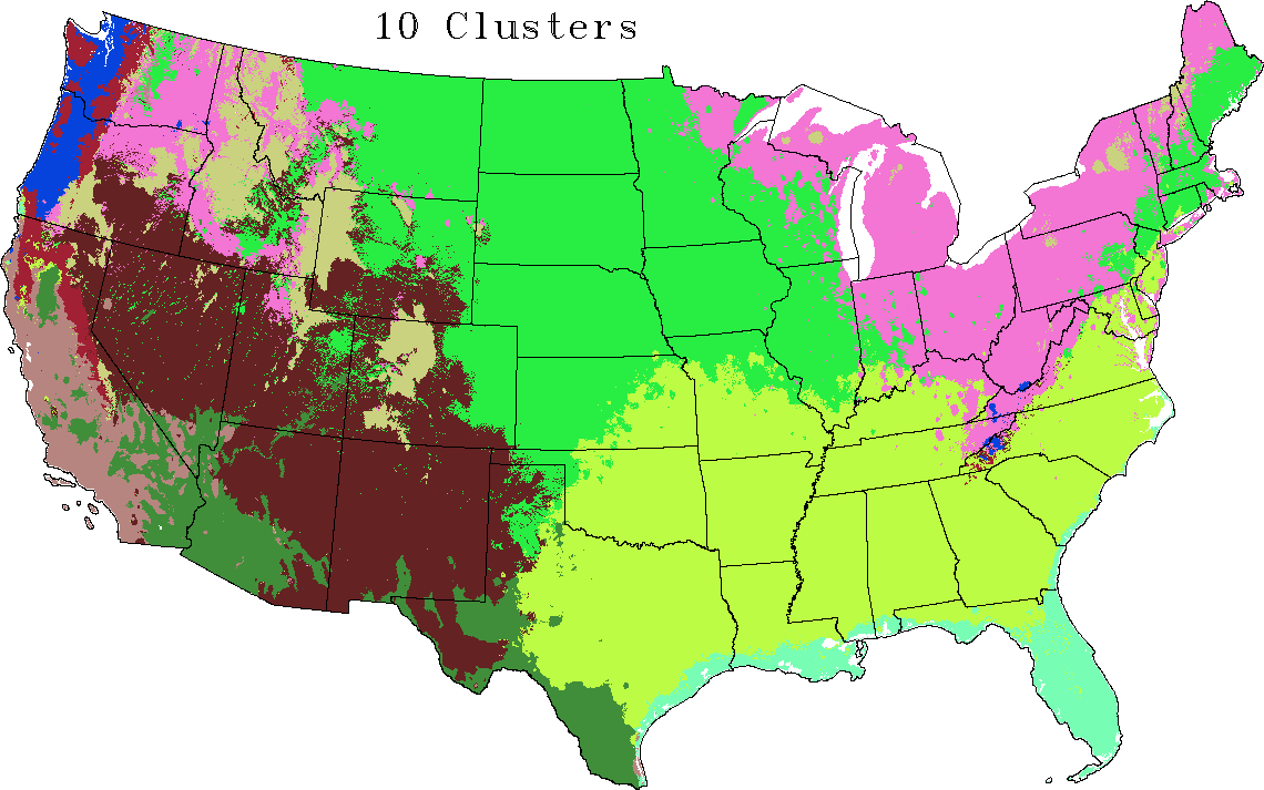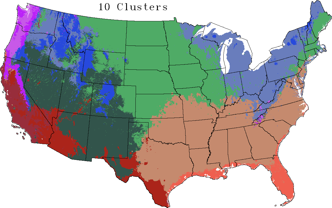 The 10-zone map still seems inadequate to capture the spatial heterogeneity present in the lower 48 United States. For example, the Rocky Mountains are not resolved into a separate zone at this coarse level of division.