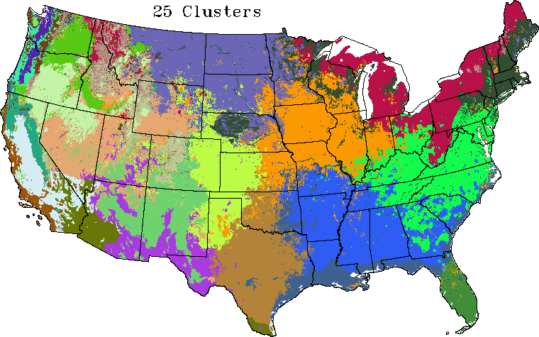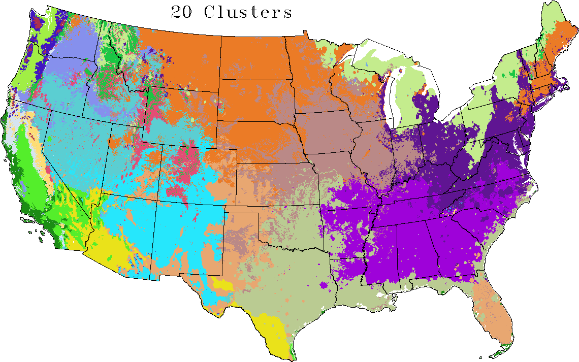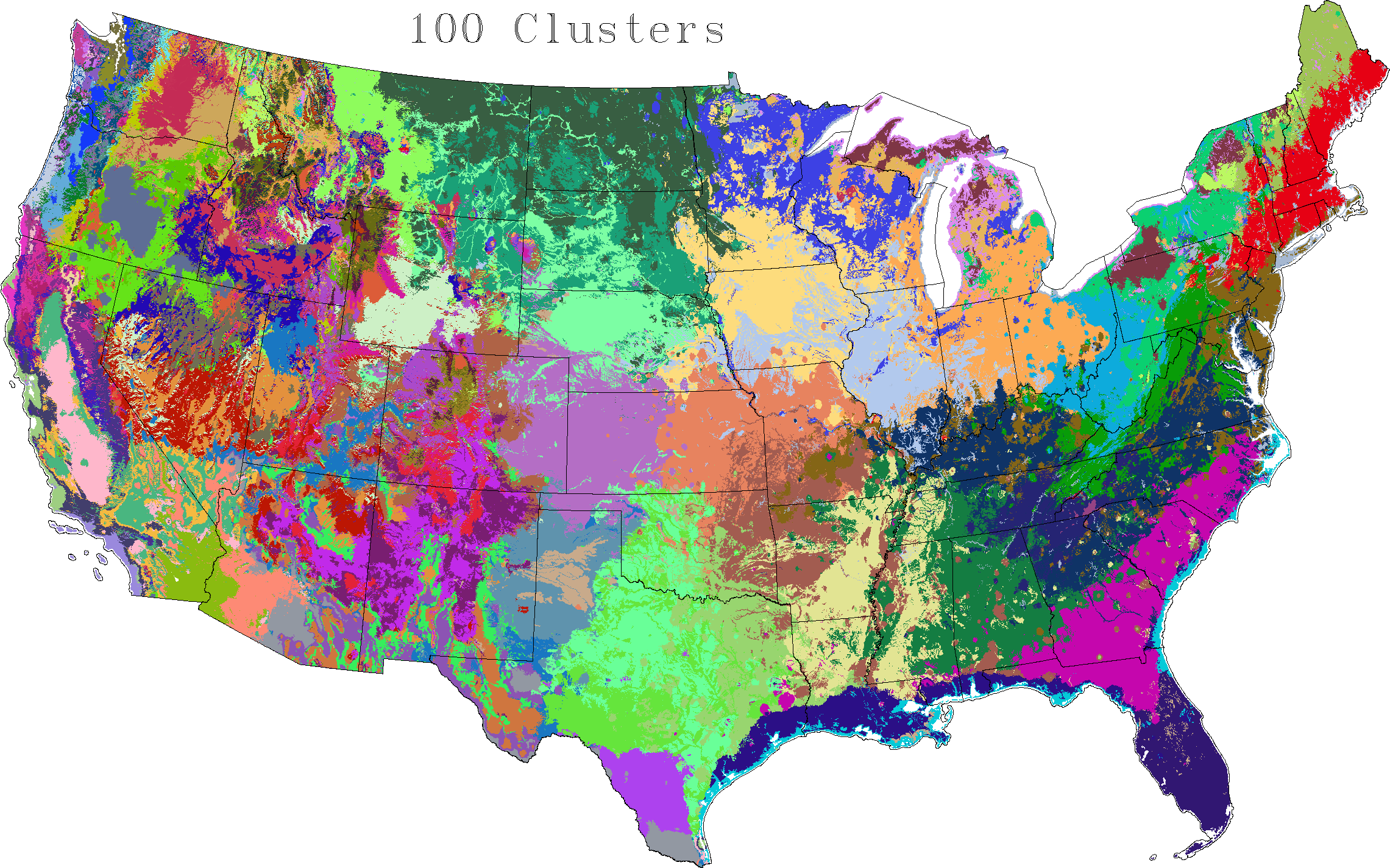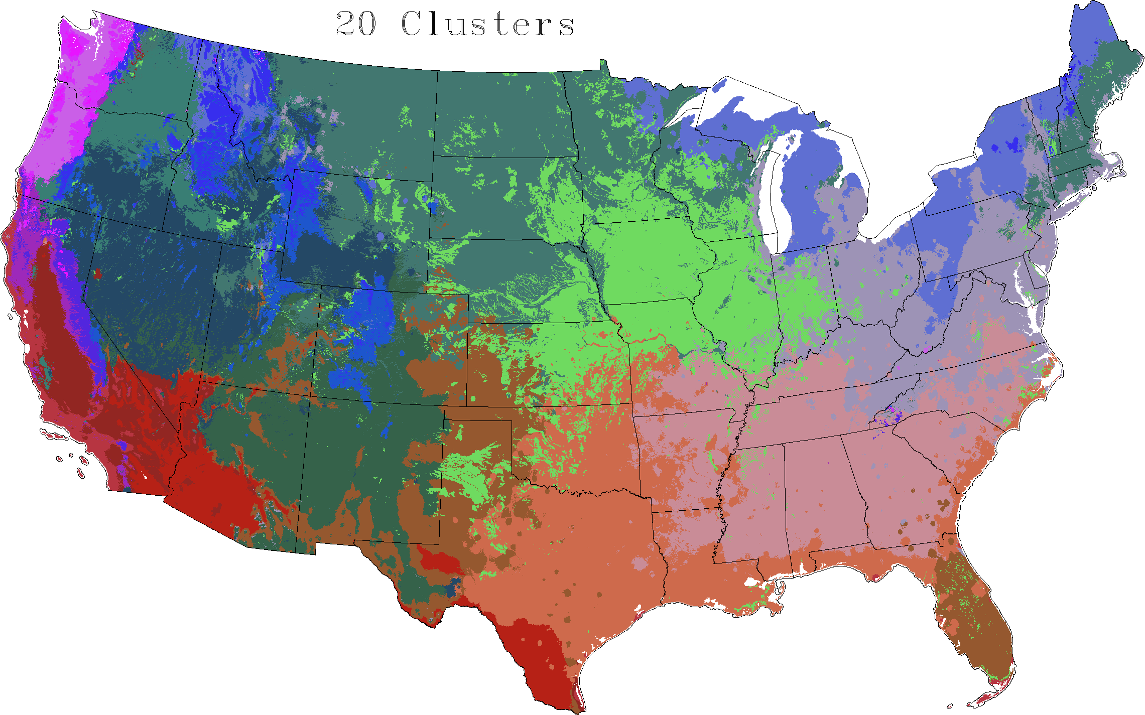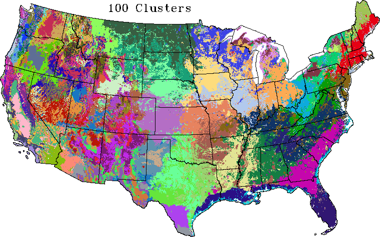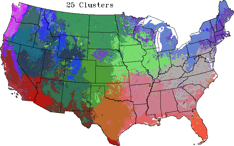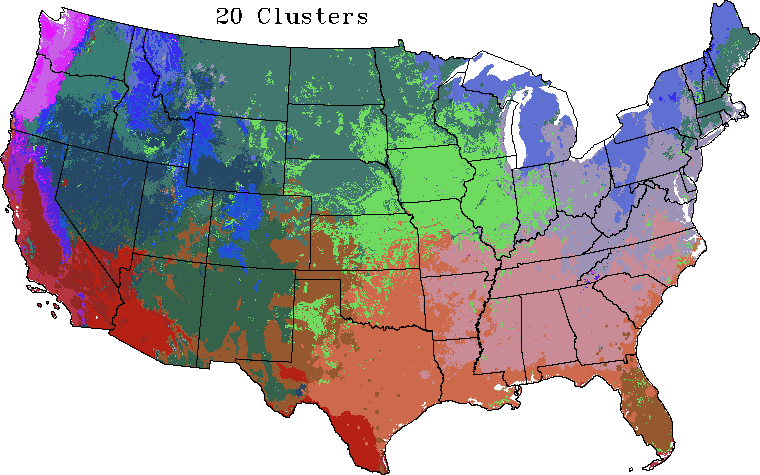 All of the zones in the above maps are shown in random colors. When colored randomly, the edges of distinct zones are easy to see. However, no information is available to show how different the mixture of included conditions is between two adjacent zones. We also have a statistical method to assign colors to each individual zone in each map such that the color shows something about the mixture of included conditions within each zone. Using this coloring method, the similarity of conditions can be compared across zones.