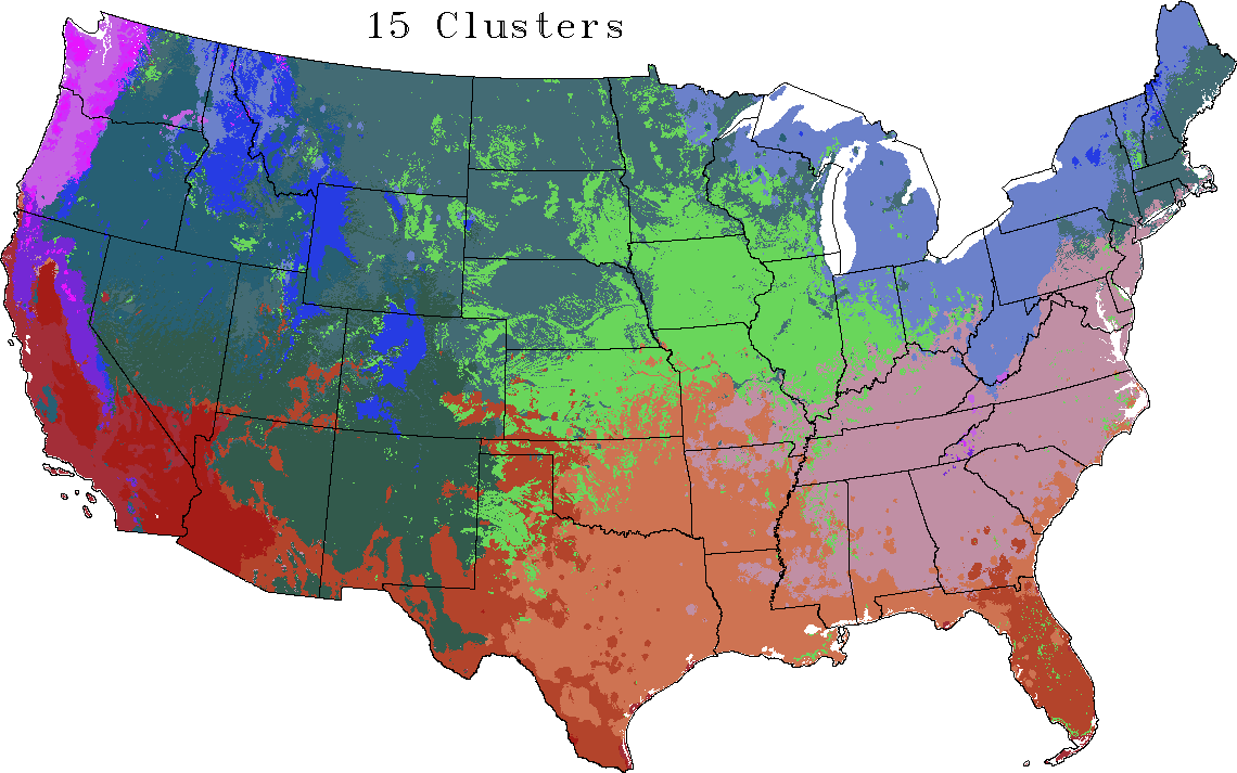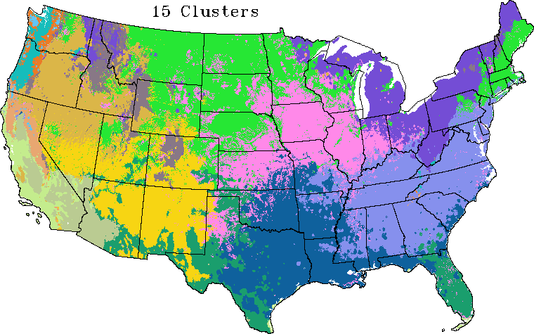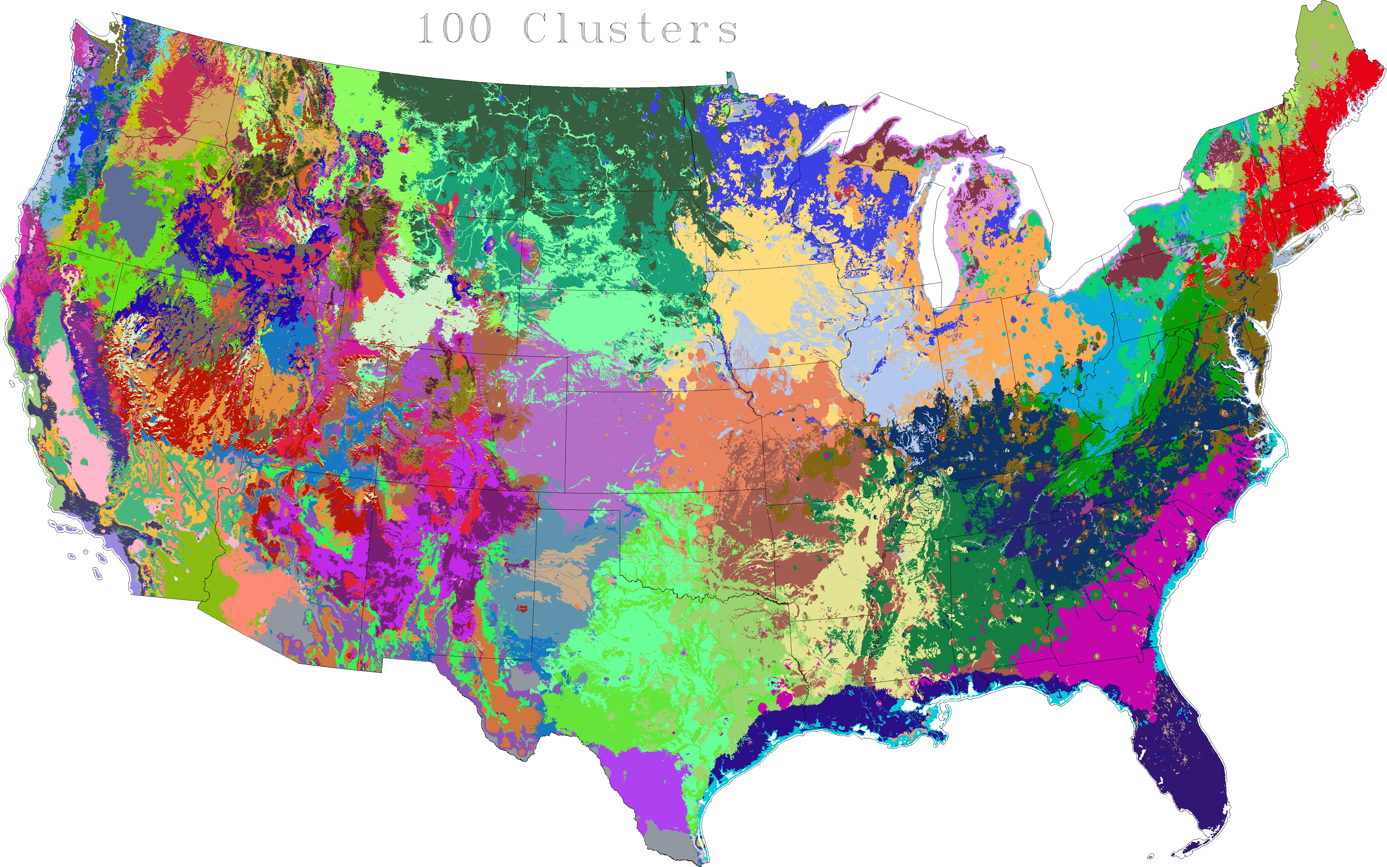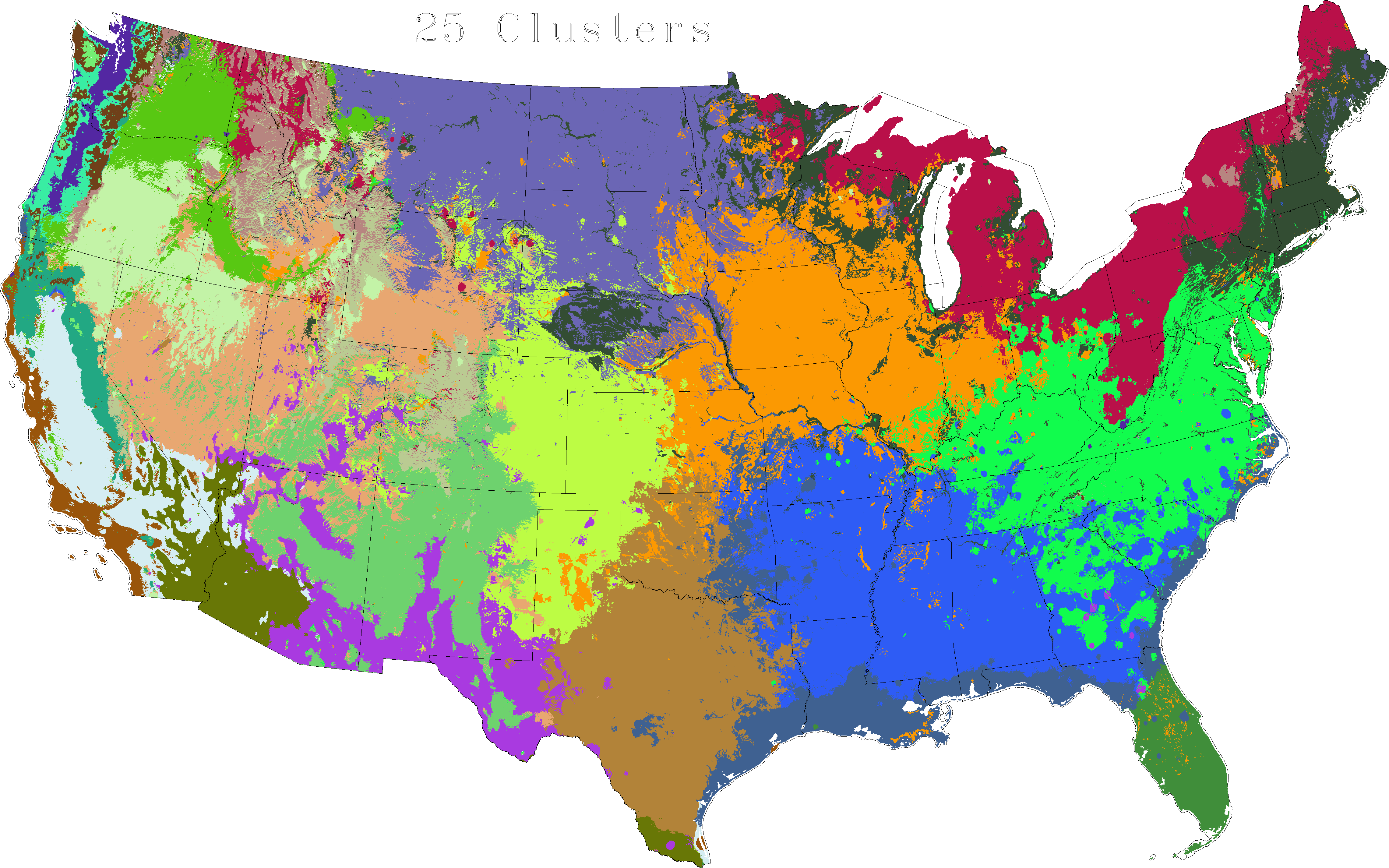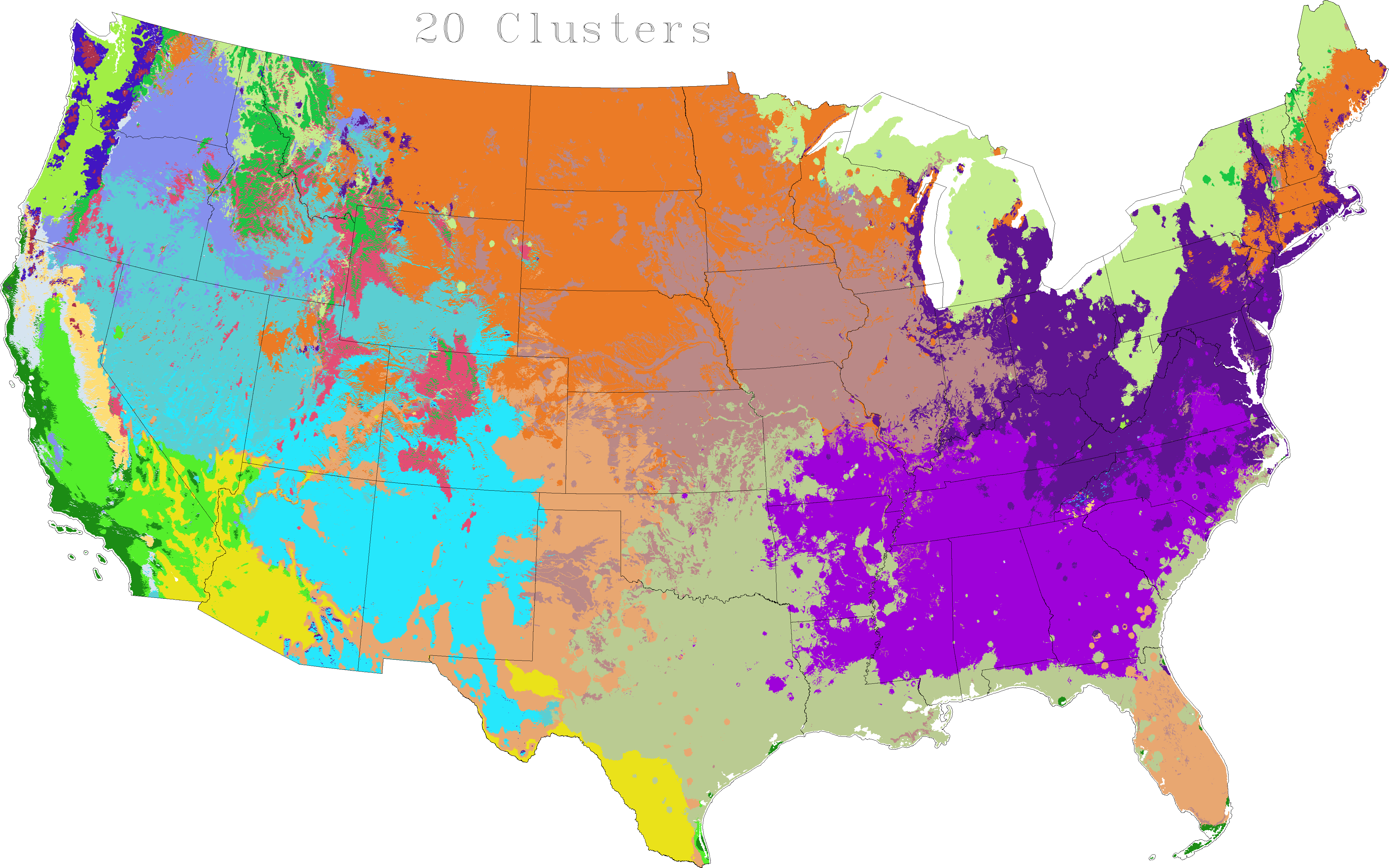 All of the zones in the above maps are shown in random colors. When colored randomly, the edges of distinct zones are easy to see. However, no information is available to show how different the mixture of included conditions is between two adjacent zones. We also have a statistical method to assign colors to each individual zone in each map such that the color shows something about the mixture of included conditions within each zone. Using this coloring method, the similarity of conditions can be compared across zones.