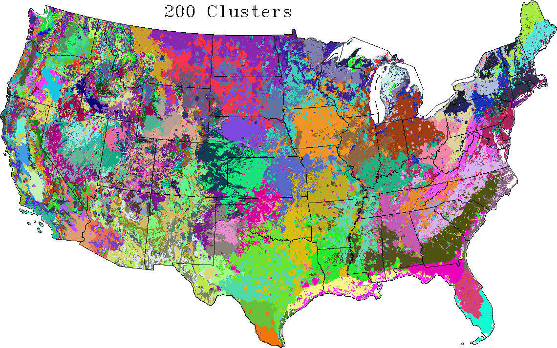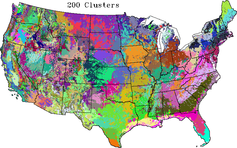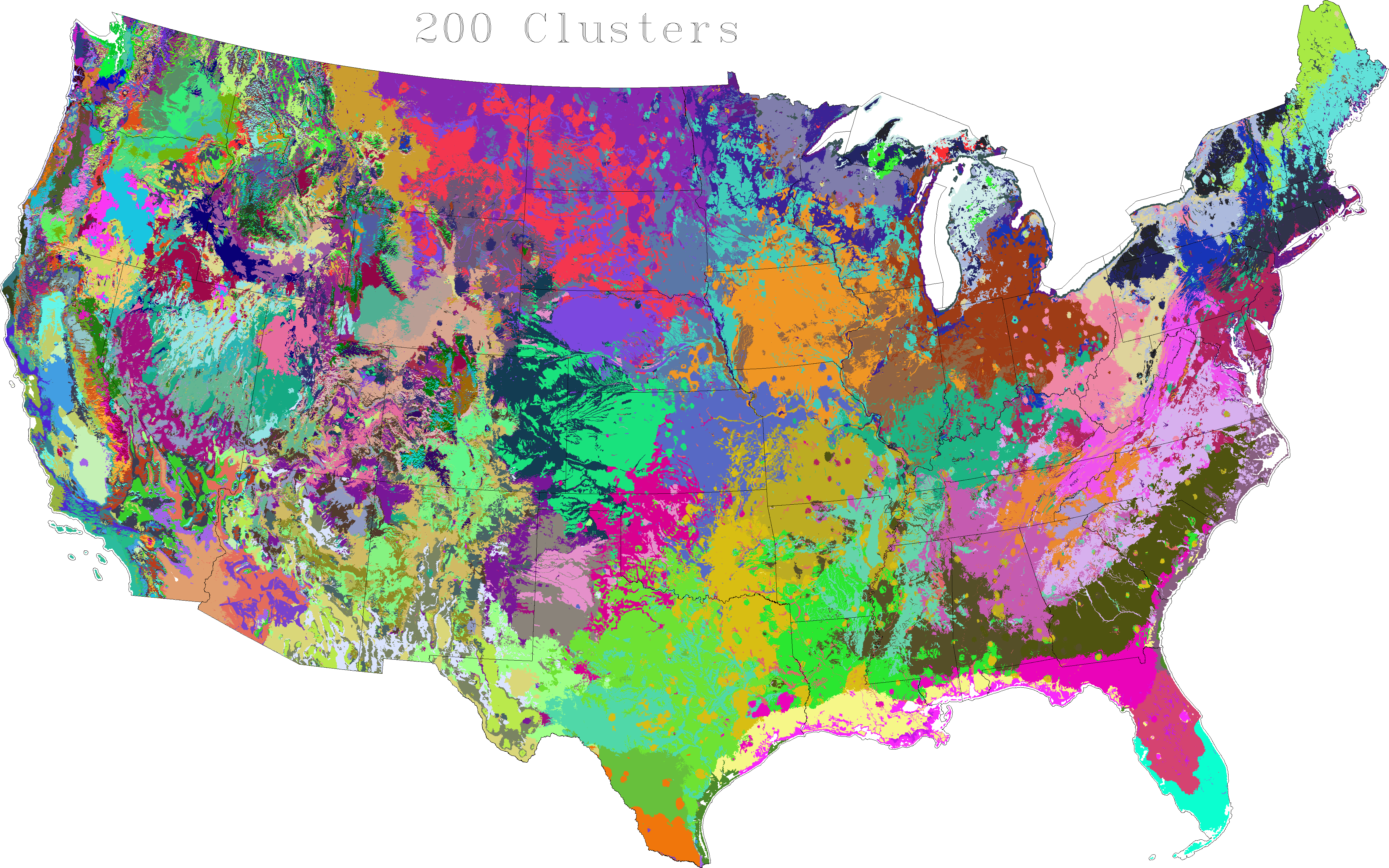 Two additional maps were prepared at much higher levels of division, 100 and 200 zones. The purpose of these two extra maps, which used the same nine input layers, is to provide context for comparison, and to demonstrate the discrimination and resolving power of the Multivariate Geographic Clustering method when provided with this input data set.