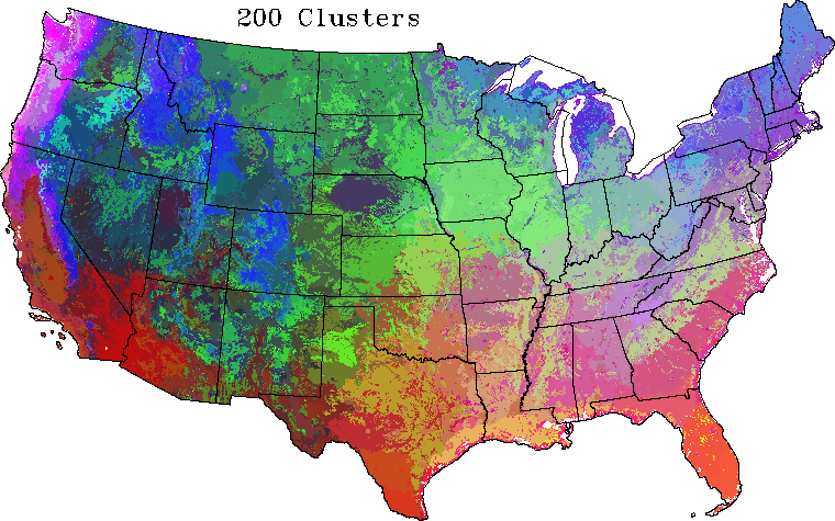All zonation maps are similar at the national scale when viewed in Similarity Colors, but more resolution and detail is present in the maps produced at higher levels of division. If additional maps were produced at even higher levels of division (i.e., 10,000 zones), such maps would be indistinguishable from the 200-zone map when colored using Similarity Colors. Thus, there is a convergence on this single map appearance at the national scale after a particular critical level of division is exceeded. No further subdivision is needed to resolve and reveal this same national pattern of gradients.