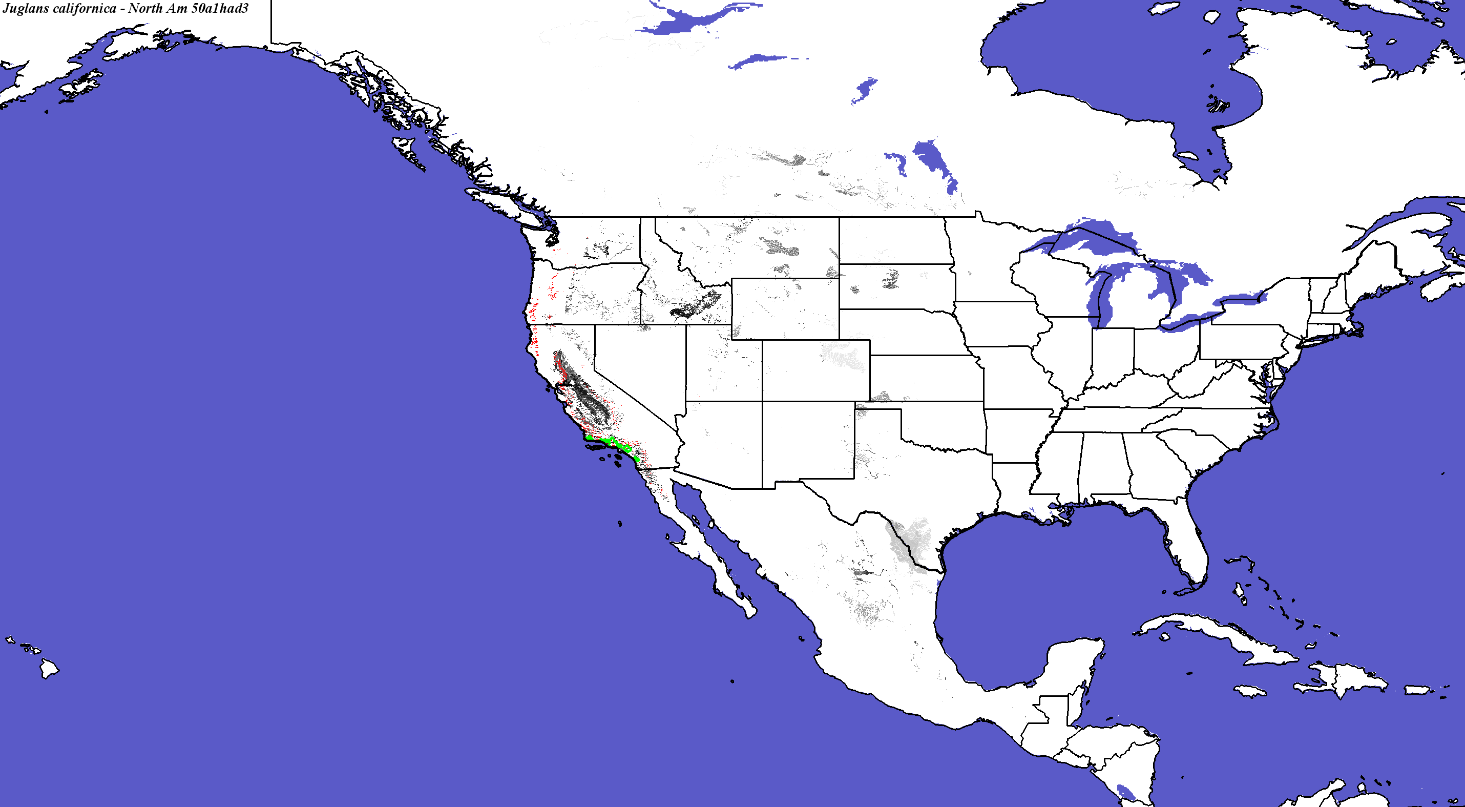 Compare with Current Range from the Silvics Manual for Juglans californica Juglans californica not modeled by Iverson and Prasad Juglans californica not modeled by Crookston and Rehfeldt Juglans californica not modeled by Coops and Waring |
