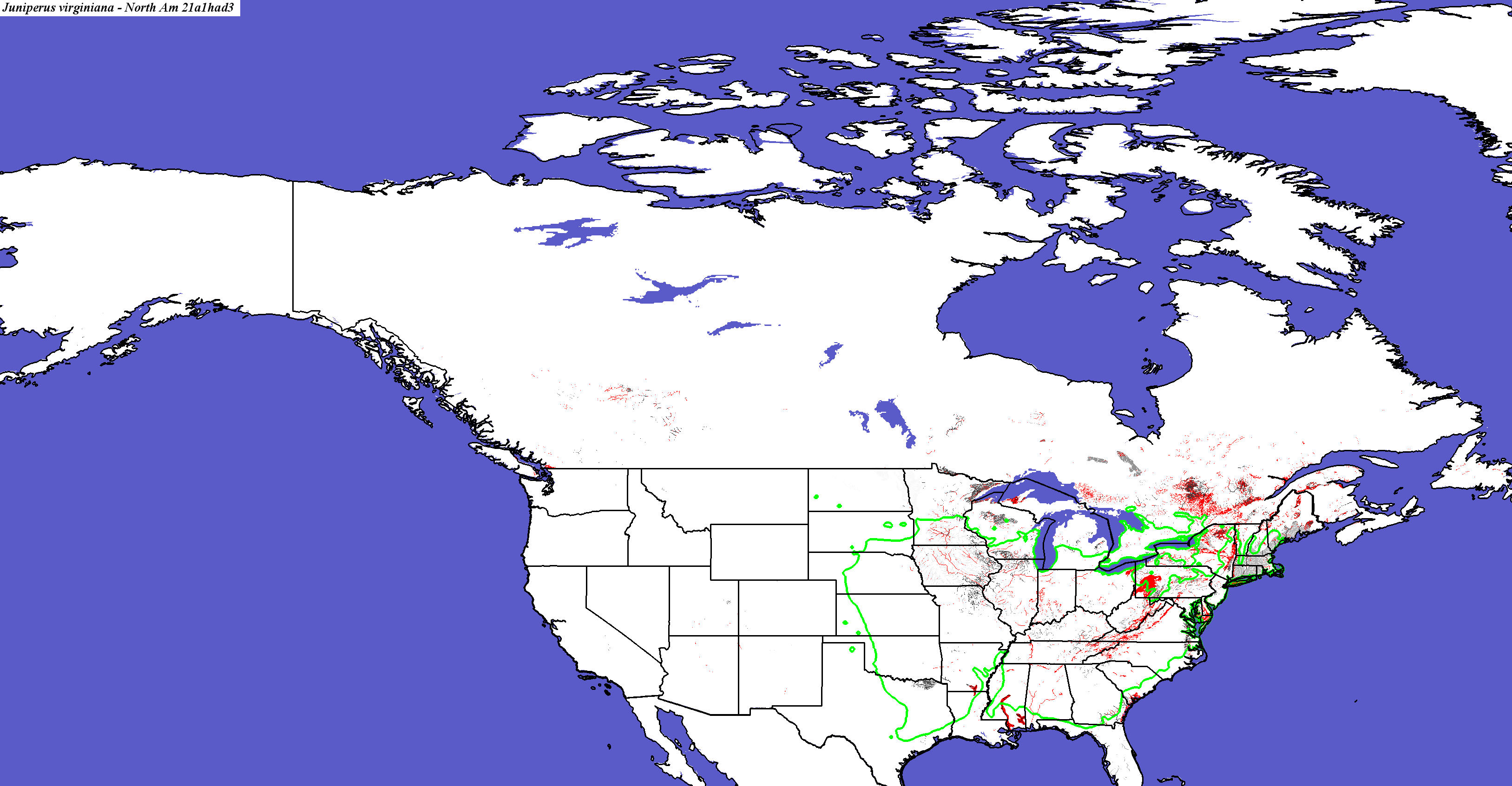Compare with Current Range from the Silvics Manual for Juniperus virginiana Compare with Juniperus virginiana modeled for Current conditions by Iverson and Prasad Juniperus virginiana not modeled by Crookston and Rehfeldt Juniperus virginiana not modeled by Coops and Waring |