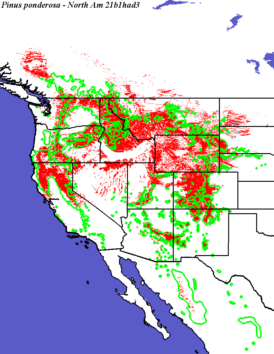 Compare with Pinus ponderosa modeled for Hadley B2 in 2060 by Crookston and Rehfeldt Compare with Pinus ponderosa modeled for Hadley B1 in 2050 by Coops and Waring |