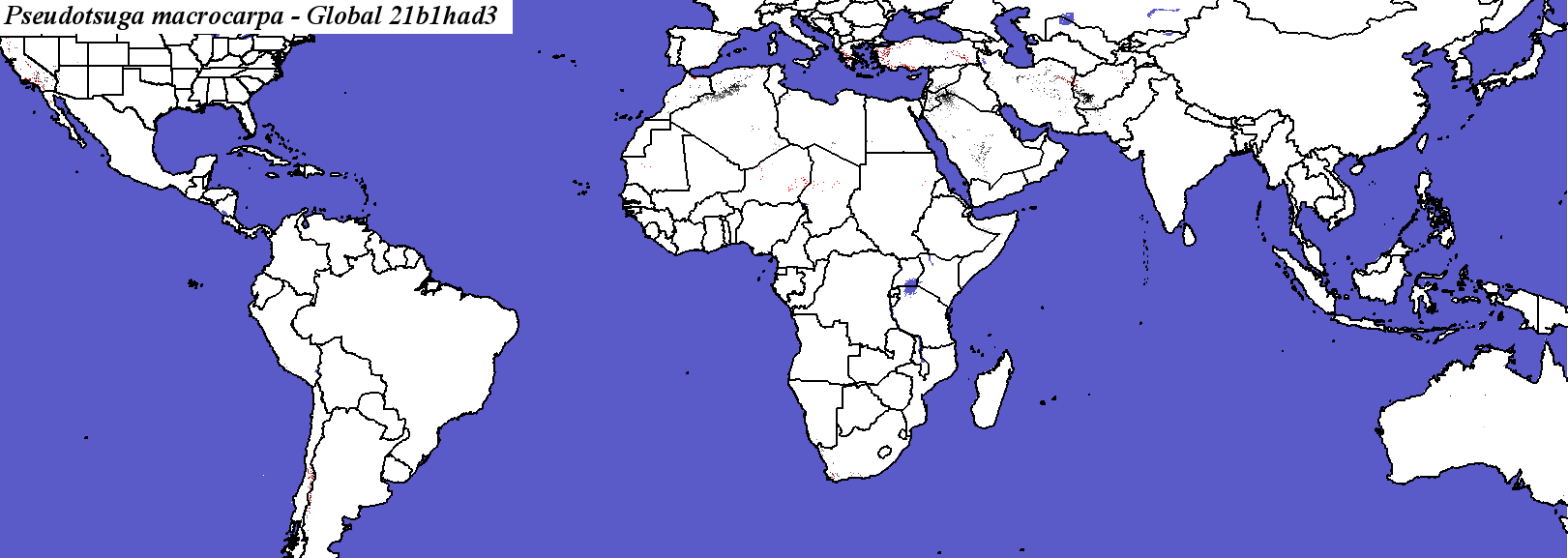 Pseudotsuga macrocarpa not modeled by Crookston and Rehfeldt Pseudotsuga macrocarpa not modeled by Coops and Waring |