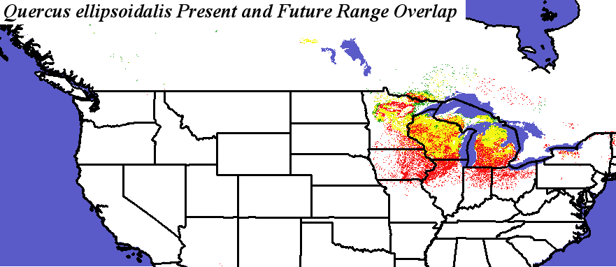 Compare with Quercus ellipsoidalis modeled for Hadley B1 in 2100 by Iverson and Prasad Quercus ellipsoidalis not modeled by Crookston and Rehfeldt |