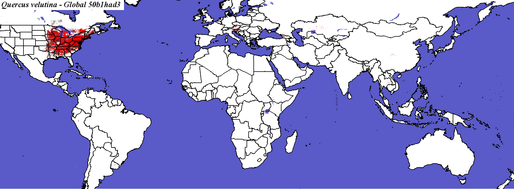 Compare with Current Range from the Silvics Manual for Quercus velutina Compare with Quercus velutina modeled for Current conditions by Iverson and Prasad Quercus velutina not modeled by Crookston and Rehfeldt Quercus velutina not modeled by Coops and Waring |