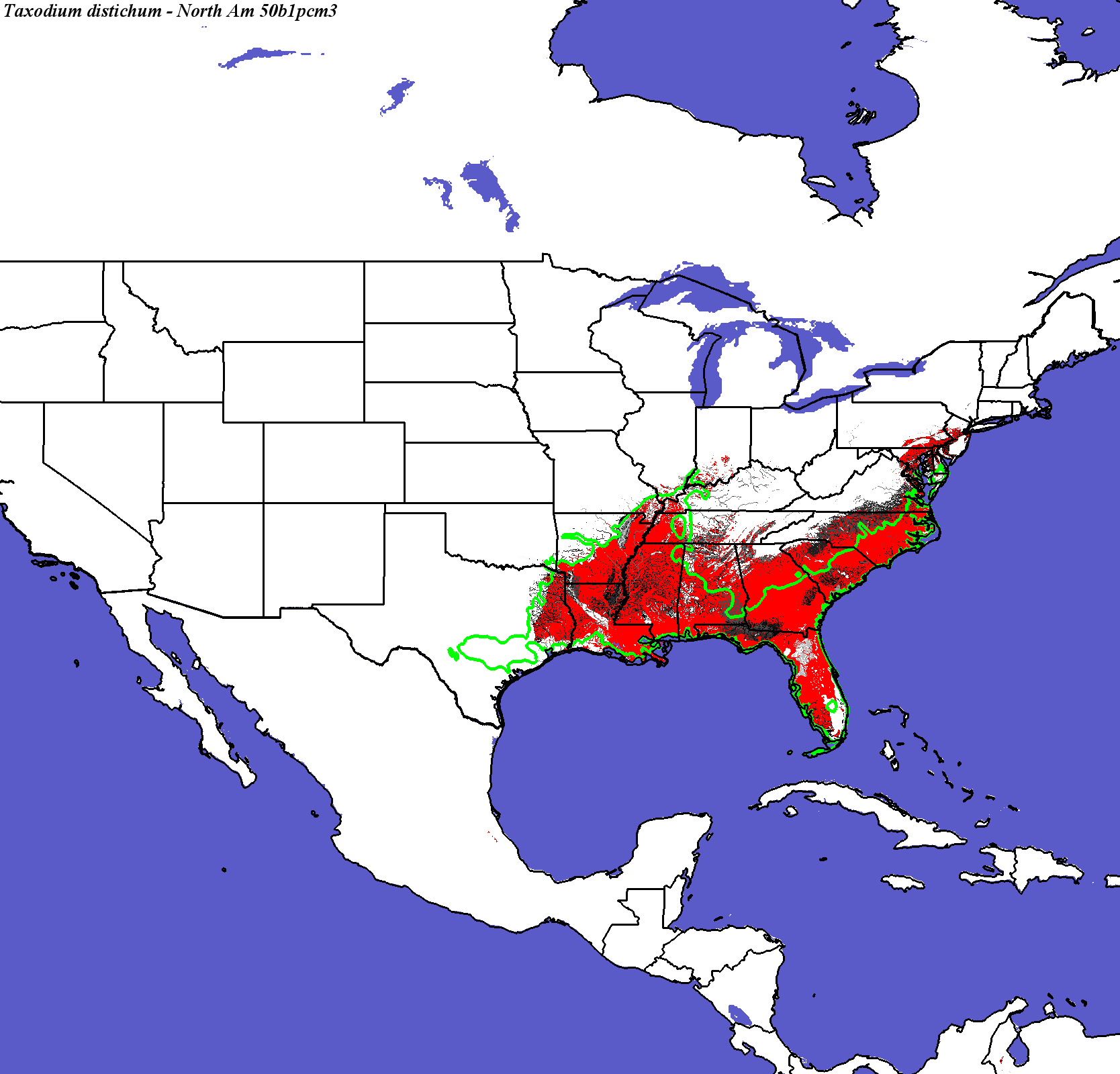 Taxodium distichum - Hargrove's Present Suitable Range Outline