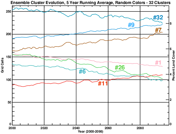 Five year running average of cluster frequency for regimes exhibiting significant global land area changes in the ensemble mean where the clusters are defined as follows: