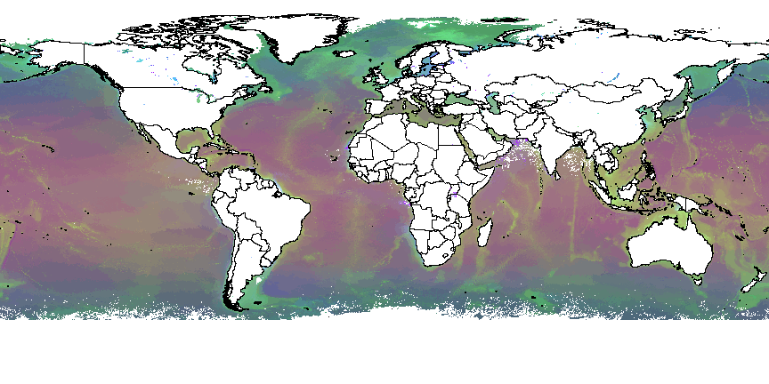 The world map below shows the 3000 most-different global aquatic ecoregions, shown in random colors, based on minimum, maximum, and mean surface water temperature, mk90, nlw551, chlorophyll content, and bathymetry.
