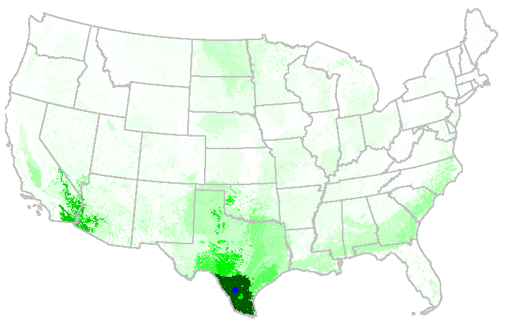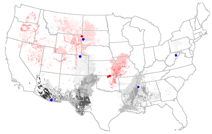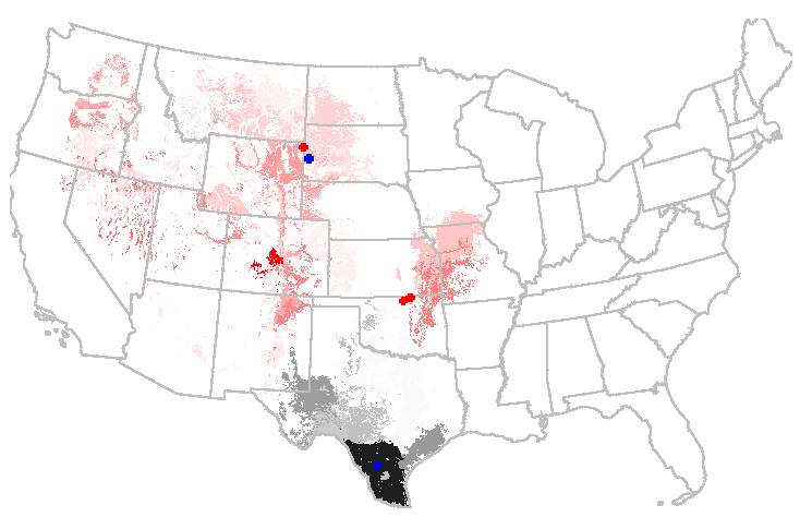 The additional Mississippi site adds some representation throughout the lower Mississippi valley. The new Arizona site adds representation in east Texas and the Sonoran desert. The loss of the two sites in Oklahoma causes decreased representation in the Central Plains. The position adjustment for the Black Hills tower causes patchy losses in representation across the Central Western states. The representation of each site could be mapped by repeating the analysis for each site individually.